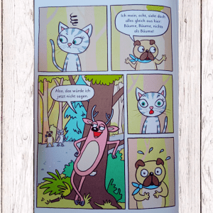 Weil ich gerade meine Vorliebe für Comics entdeckt habe, geht es heute weiter mit einem tollen Abenteuercomic für Kinder aus dem cbj Verlag. Von Mops und Kätt gibt es zwei Bände. Band 1: Mops und Kätt entdecken den Wald und Band 2: Mops und Kätt fahren ans Meer. Man kann die Bücher unabhängig voneinander lesen, aber ich habe mich trotzdem entschieden, mit Band 1 zu beginnen. In der Vergangenheit ist mir immer wieder aufgefallen, dass es für uns besser passt, wenn wir die handelnden Figuren schon kennen. Und die sind bei Mops und Kätt ganz besonders drollig.