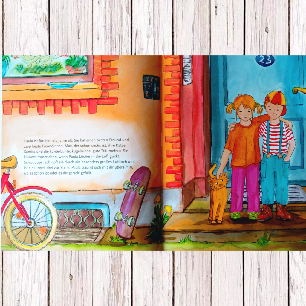 Mit einer schützenden Träumefrau im Hintergrund blicken Paula(5) und ihr Freund Max (6) vom leuchtend gelben Cover und sind für jüngere Kinder passende Protagonisten mit denen sie sich gut identifizieren können. Während des Lesens lernt man die beiden besser kennen. Paula, ein mutiges, selbstbewusstes Mädchen, das gerne träumt und genau weiß was sie will, oder auch nicht will. Es ist schön zu sehen, wie Paula lernt ihren Gefühlen zu vertrauen, Grenzen zu setzen und Bestimmerin über ihren Körper zu sein.