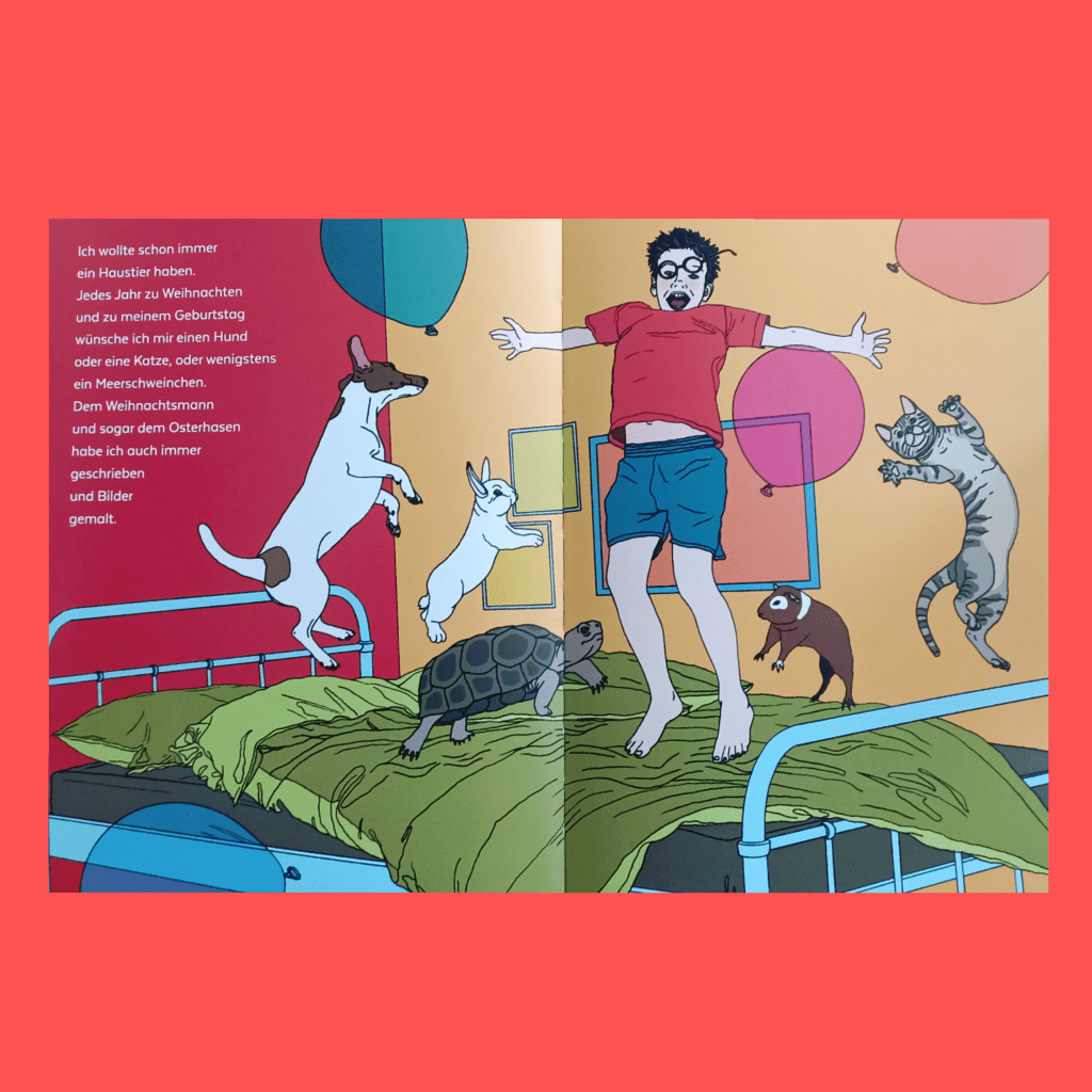 In diesem Buch geht es um ein Thema, mit dem alle Eltern irgendwann konfrontiert werden. Der Wunsch nach einem Tier. Dies hat die Autorin wunderbar aufbereitet. Zum einen durch die knalligen und einprägsamen Illustrationen, die die Geschichte lebendig werden lassen, zum anderen mit viel Phantasie und einer Prise Humor.