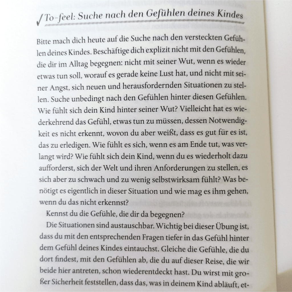 dass Kinder sich nicht gegen ihre Eltern stellen wollen, sondern immer etwas für sich tun , um ihre eigenen Grenzen zu wahren. Hieraus können wir Erwachsene sehr viel lernen. Denn es ist nicht nötig, das Kind zu begrenzen, wenn man nur seine eigenen Grenzen wahrt. Besonders wichtig und auch eindrucksvoll waren für mich die Kapitel über „Die Gefühle deines Kindes“ und „Trigger und emotionale Blockaden.“