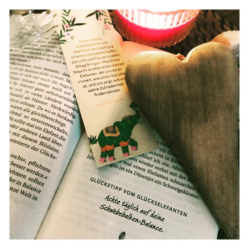 Das Buch hat mir sehr gefallen. Es ist in kleine Kapitel gegliedert, die zum Innehalten und Nachdenken anregen. Dabei sind die Glückstipps in eine süße Erzählung eingebettet und der kleine Elefant wird zu einem verlässlichen, stillen Begleiter. Denn über das Lesen hinaus ist es kein Buch fürs Regal. Es ist ein Wegbereiter, den man immer wieder zur Hand nehmen kann -und sollte, um zu sich selbst zu finden.