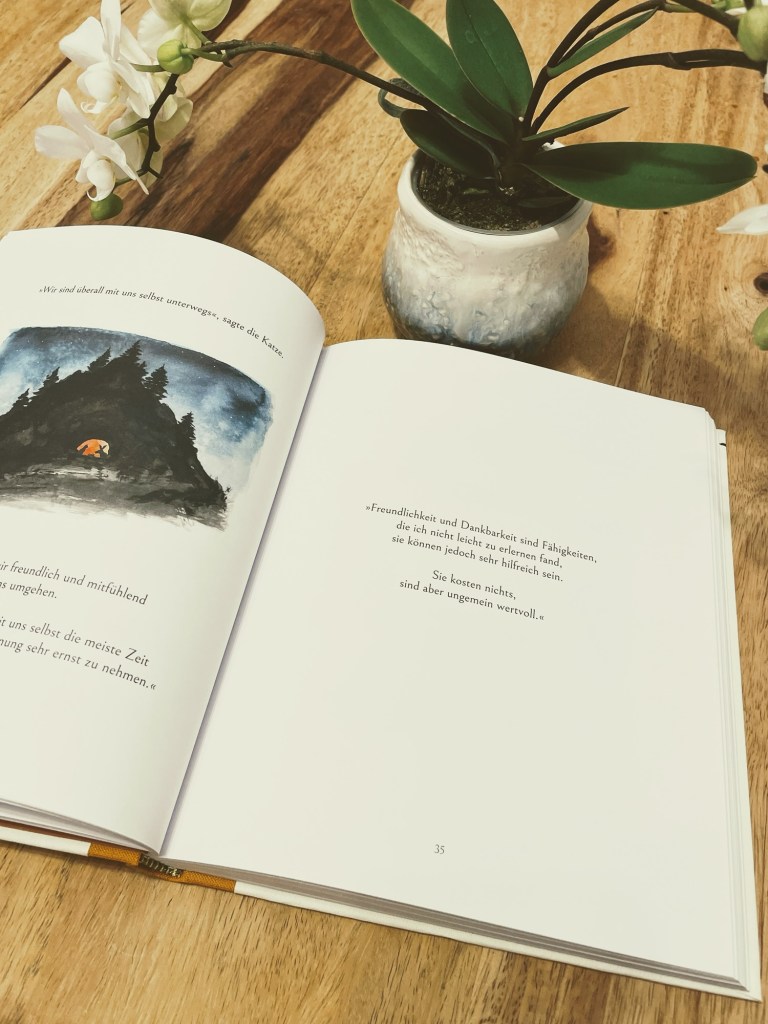 Das neue Buch von James Norbury „Die Katze die nach Weisheit sucht“ ist ein solches Buch . Rein äußerlich besticht es durch seinen reduzierten, hochwertigen Leinen- Einband. Sobald man es aufschlägt, fallen einem sofort die außergewöhnlich schönen Illustrationen im Wasserfarben- und klassischem Sumi-e Stil ins Auge. Sie wirken verspielt, dennoch minimalistisch. Beim Betrachten kann man die Bilder auf sich wirken lassen und man kommt zur Ruhe.