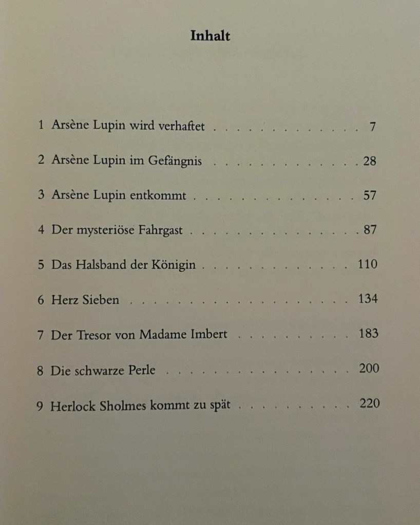 Französischen übersetzt von Felix Mayer, begegnen einem einige altbekannte Geschichten, wie z.B. „Arsène Lupin wird verhaftet“ , „Arsène Lupin entkommt“ oder „Die schwarze Perle“.